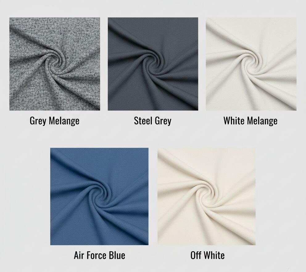 Navy Chacoal Melange Navy Melange Antra Melange Grey Melange Steel grey White Melange Air force Off White White Bottle Green Coffee brown Maroon Military Green Violet Mustard L/ Yellow Skin Water blue Rani rose Red Rose Royal blue Baby pink Biscuit Sky blue Lit/Blue G/Yellow Orange PAK/Green |